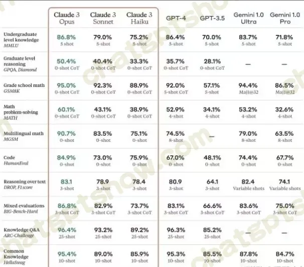 Claude 3系列模型包括三个版本:Claude 3 Haiku、Claude 3 Sonnet与Claude Opus。其中,Claude 3 Sonnet对标GPT 3.5,而Claude 3 Opus则对标GPT 4.0。至于Haiku,建议直接忽略,因为官网上并未提供该模型的相关信息。以下是官方的测评。