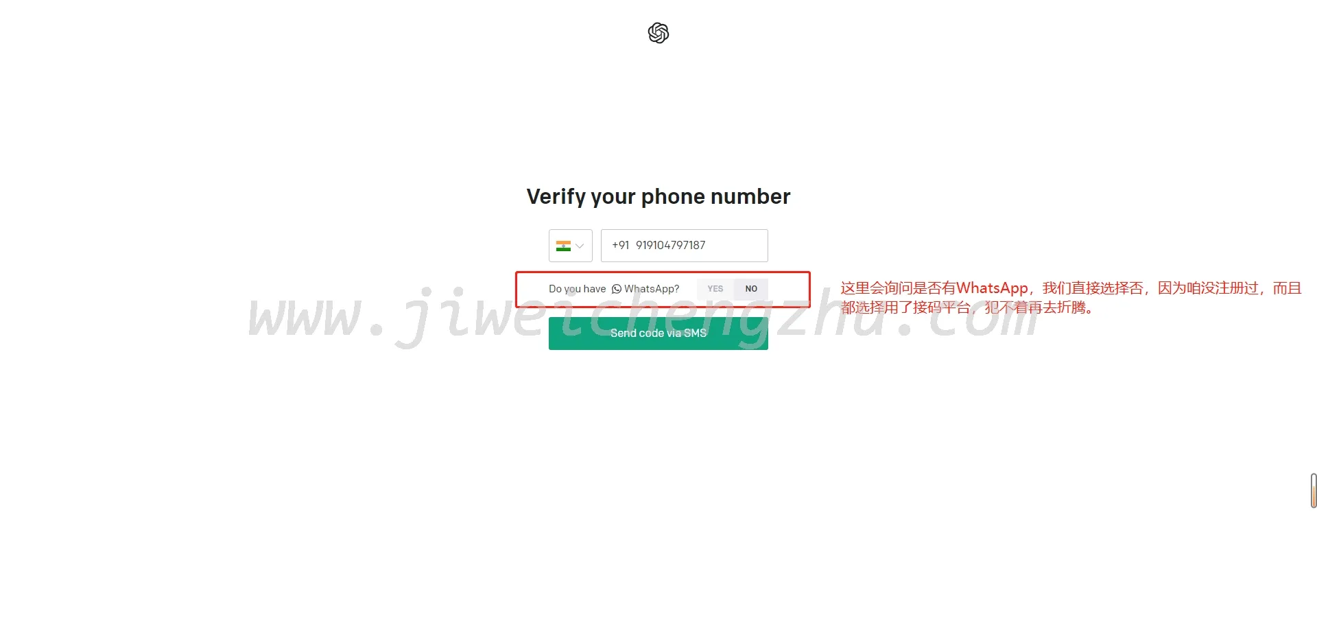 在发送验证码后,系统会询问您是否有 WhatsApp,选择“否”。