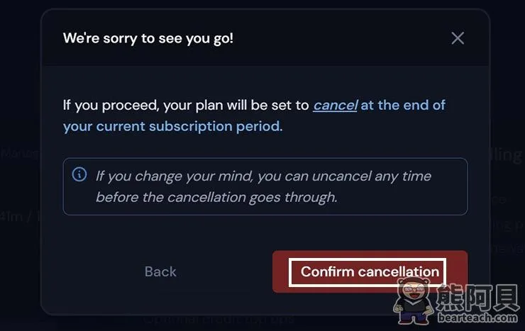 - 点击“Confirm cancellation”确认取消订阅。