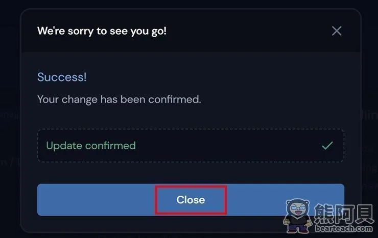 - 出现此画面,即表示成功取消订阅,点击“Close”关闭。