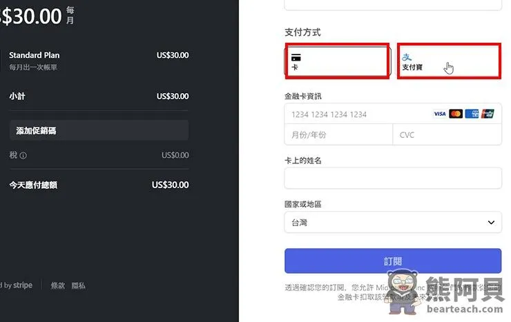 - 选择支付方式,输入支付信息,即可完成订阅。