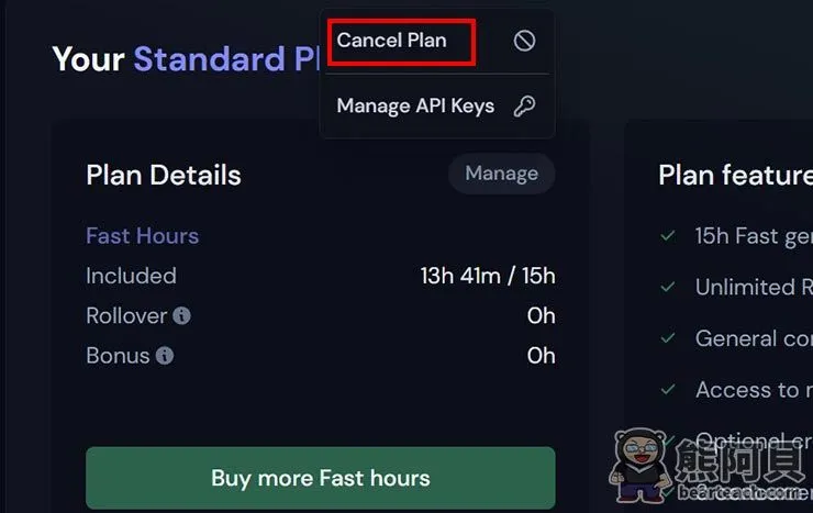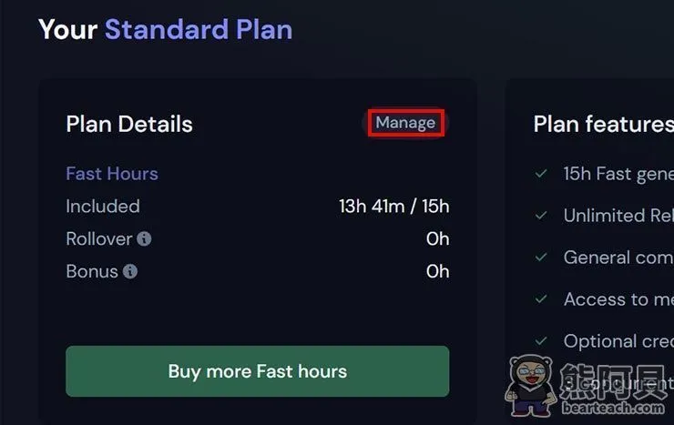 - 标准计划:每月24美元,快速模式15小时,放松模式可无限次生成图片。