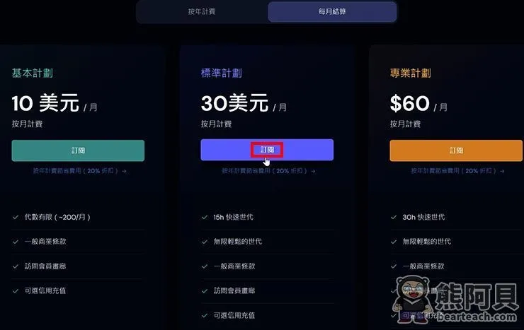 - 标准计划:每月30美元,快速模式15小时,放松模式可无限次生成图片。