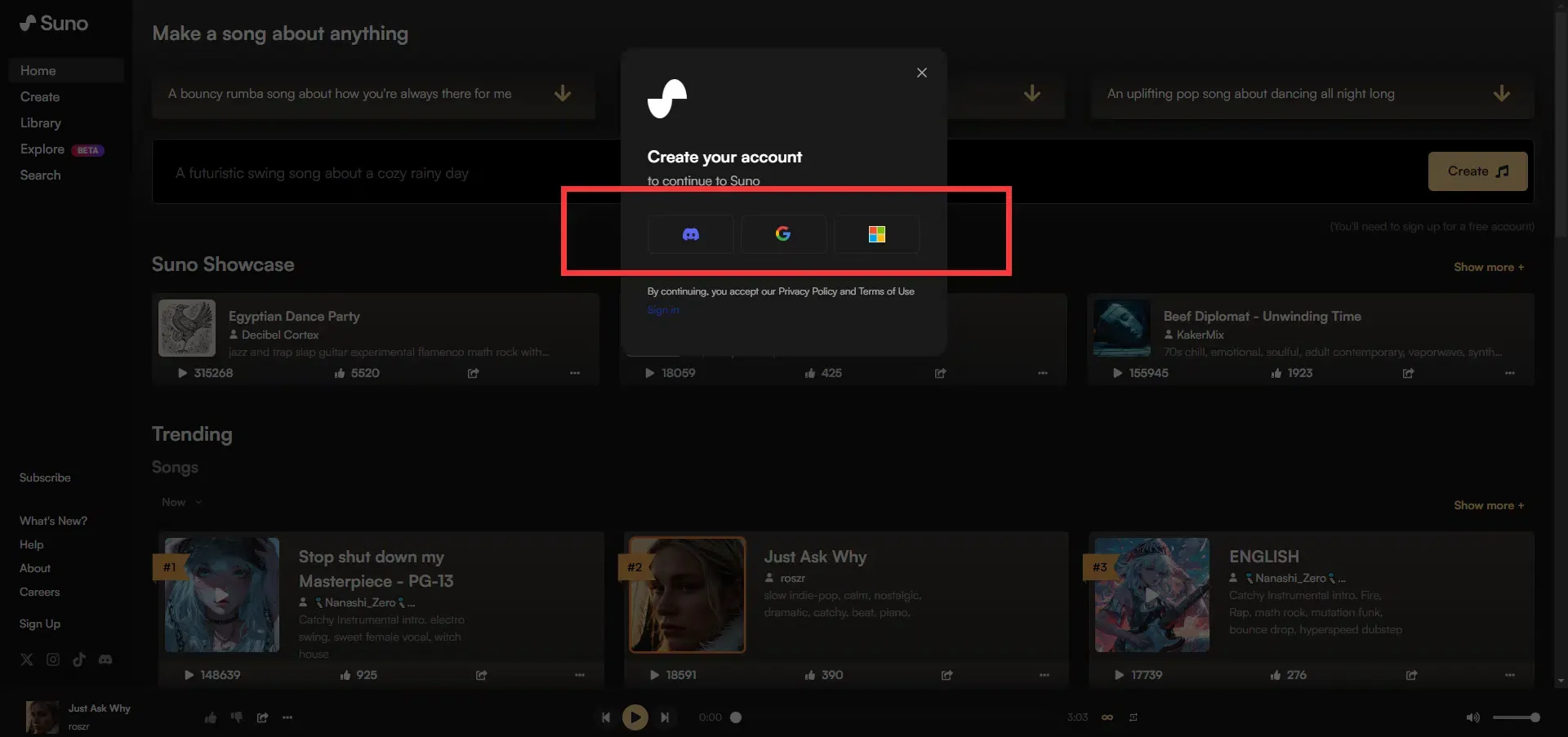 Suno 只支持其他账号的授权注册,不支持邮箱注册。可通过以下三种方式注册: