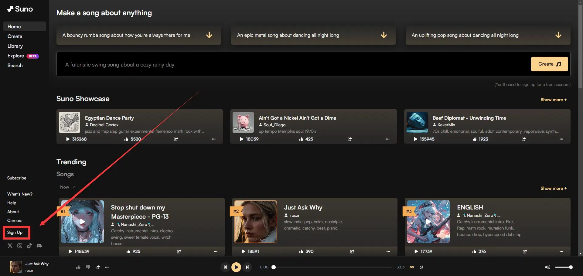 首先,打开首页(suno.com),点击左下角的“Sign Up”进入注册页面。