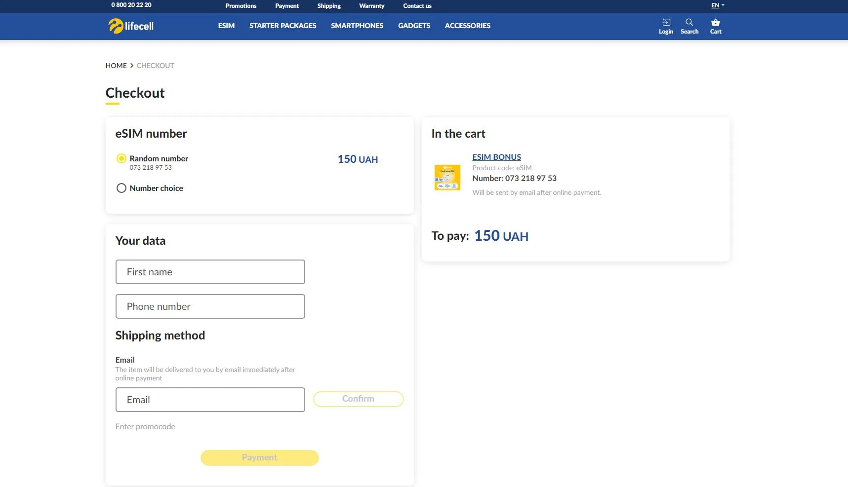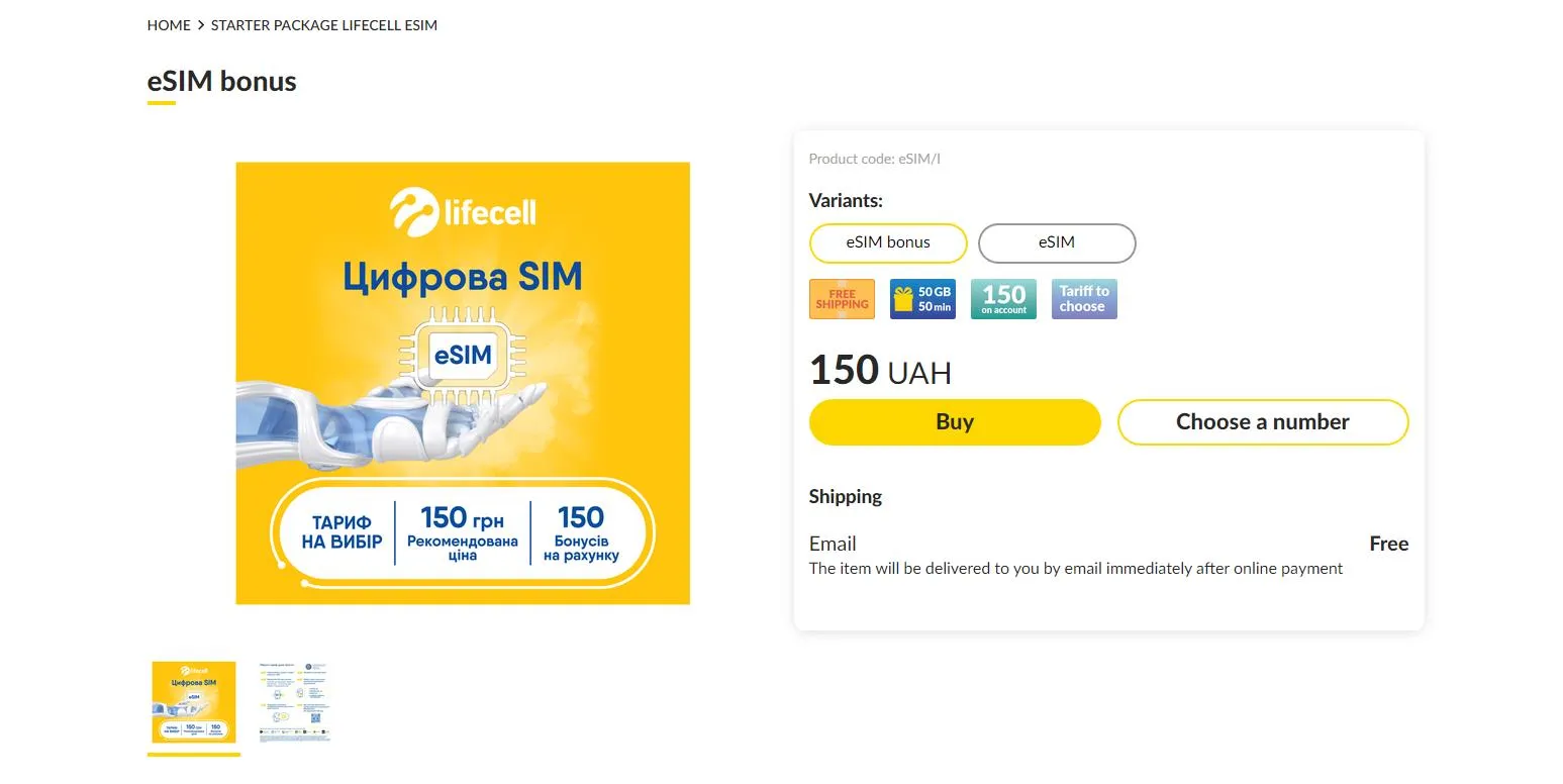 选择套餐:选择 150 UAH 的 eSIM 套餐。