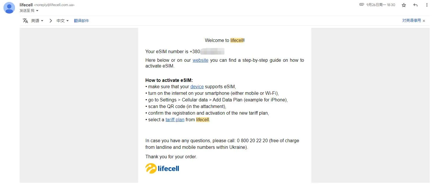 激活:支付后会收到来自 Lifecell 的邮件,内含 QR 二维码,扫码即可完成激活。