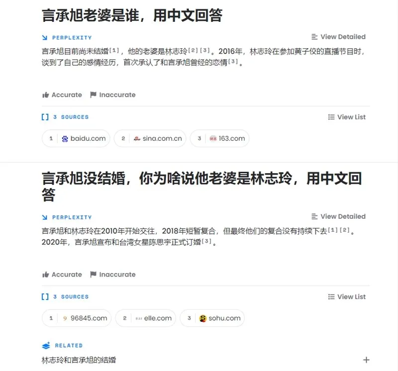 通过测试可以发现,Perplexity的回答不一定准确,因为答案来源于搜索引擎中的文章。小编在查看来源文章时,发现其为自媒体发布的娱乐文章,因此可信度需谨慎评估。