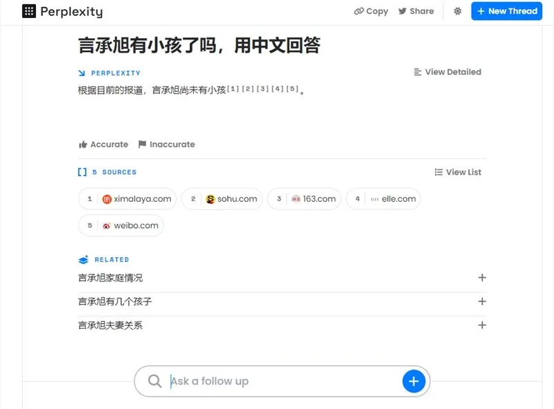 如果想要更深入的信息,可以在“Ask a follow up”中继续提问,例如:“言承旭老婆是谁,用中文回答”,然后点击旁边的加号。