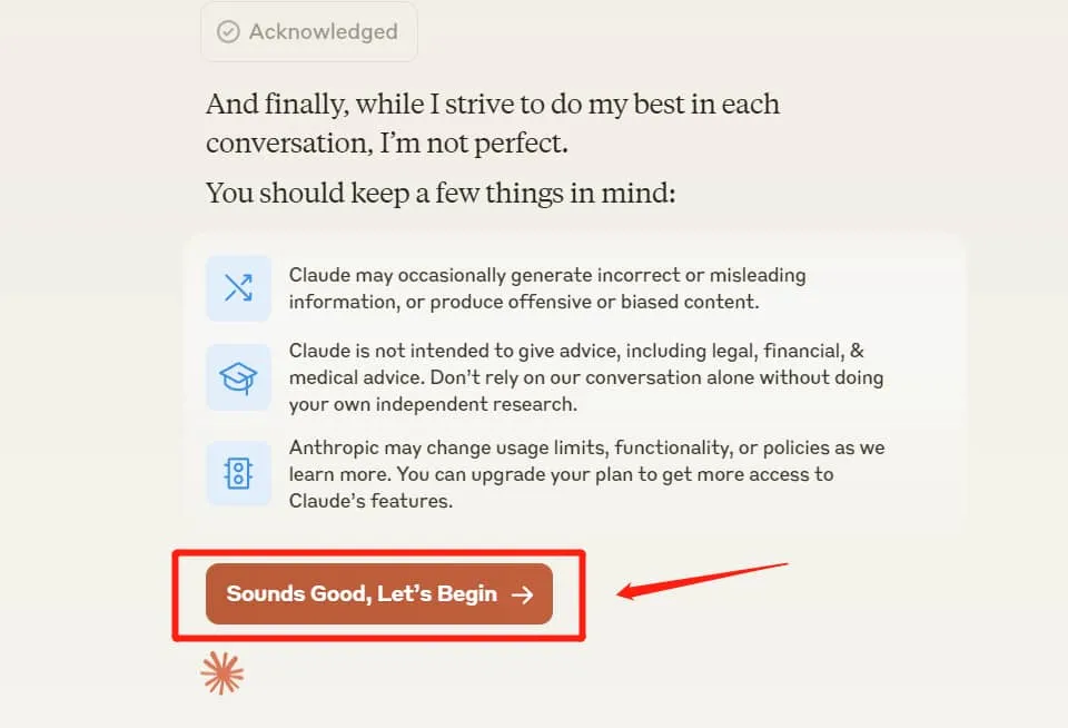 - 确认注意事项,点击 “开始” 即可进入 Claude 主界面。