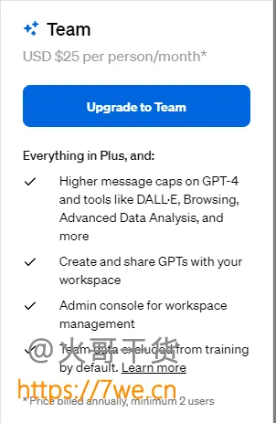 与 ChatGPT Plus 版本相比,Team 版本不仅能访问 ChatGPT 4、DALLE 等高级模型,还提供了 更长的上下文窗口、更多的对话次数,并且保证用户产生的数据不会被用于训练 GPT 模型。