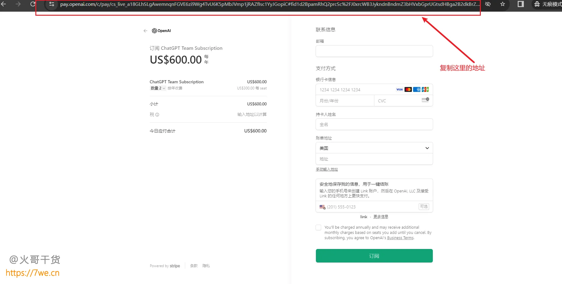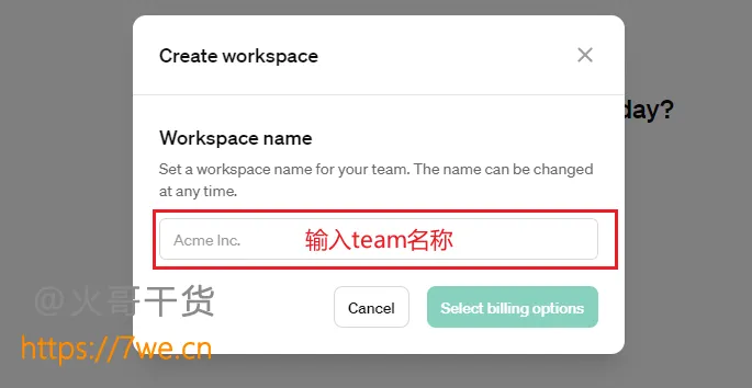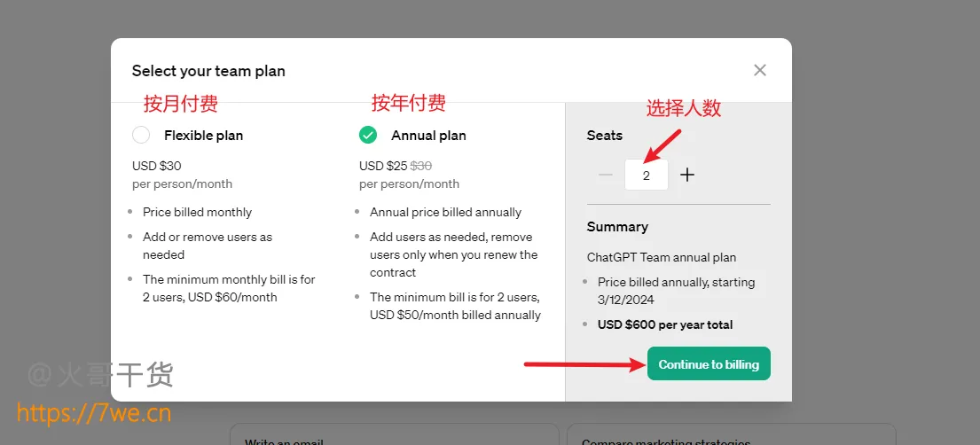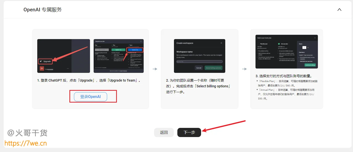 接着按照图中步骤进入 ChatGPT 官网,选择你需要的订阅方式、团队人数、团队名称设置好之后,点击下一步。