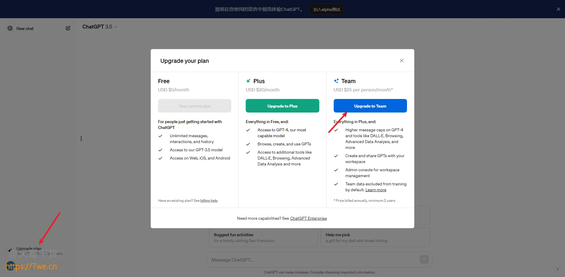 首先进入 OpenAI 网站首页,点击左下角的 Upgrade plan 按钮,在弹出的页面中选择第三项,点击 Upgrade to Team 按钮。