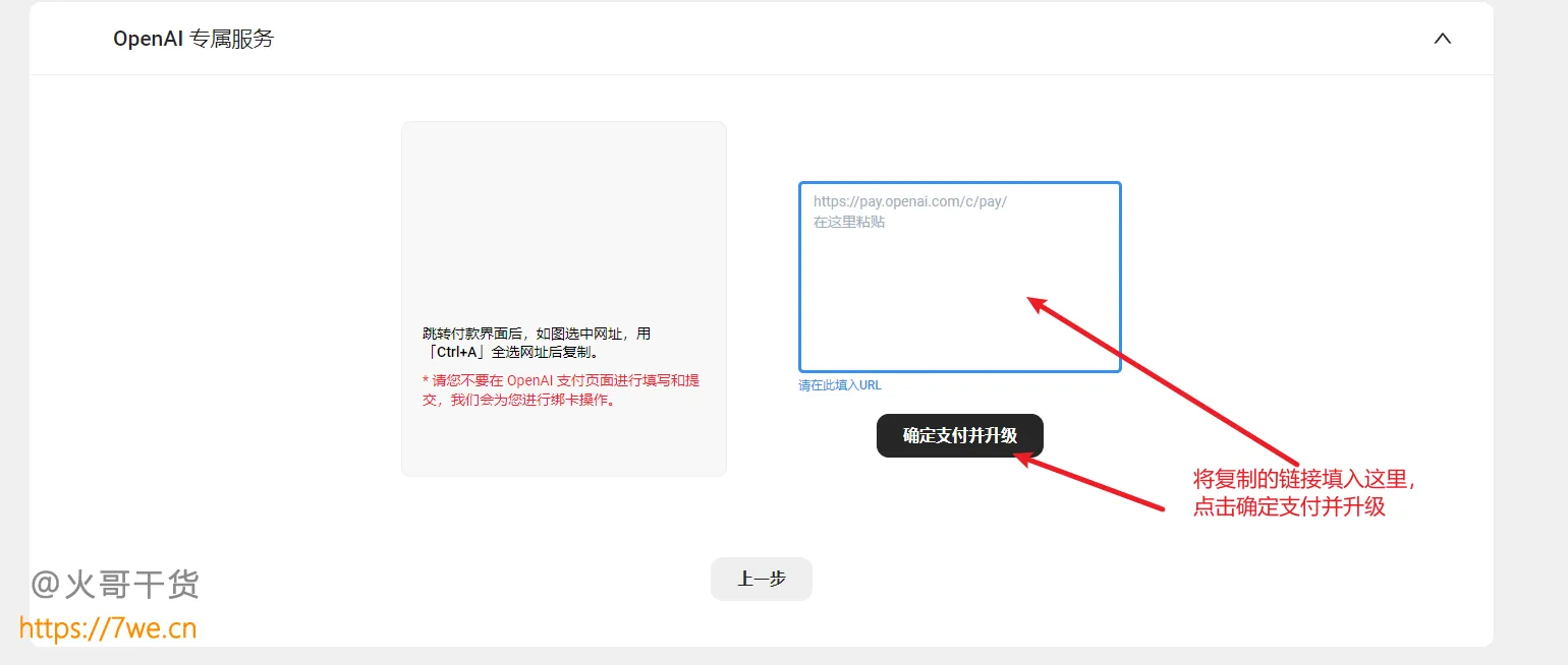 打开 野卡 的我的服务页面,点击按钮 ChatGPT Plus/Team 一键升级,在弹出的页面中按照操作步骤复制付款界面的网址粘贴到输入框中,点击确认支付并升级即可升级到 GPT 4.0。