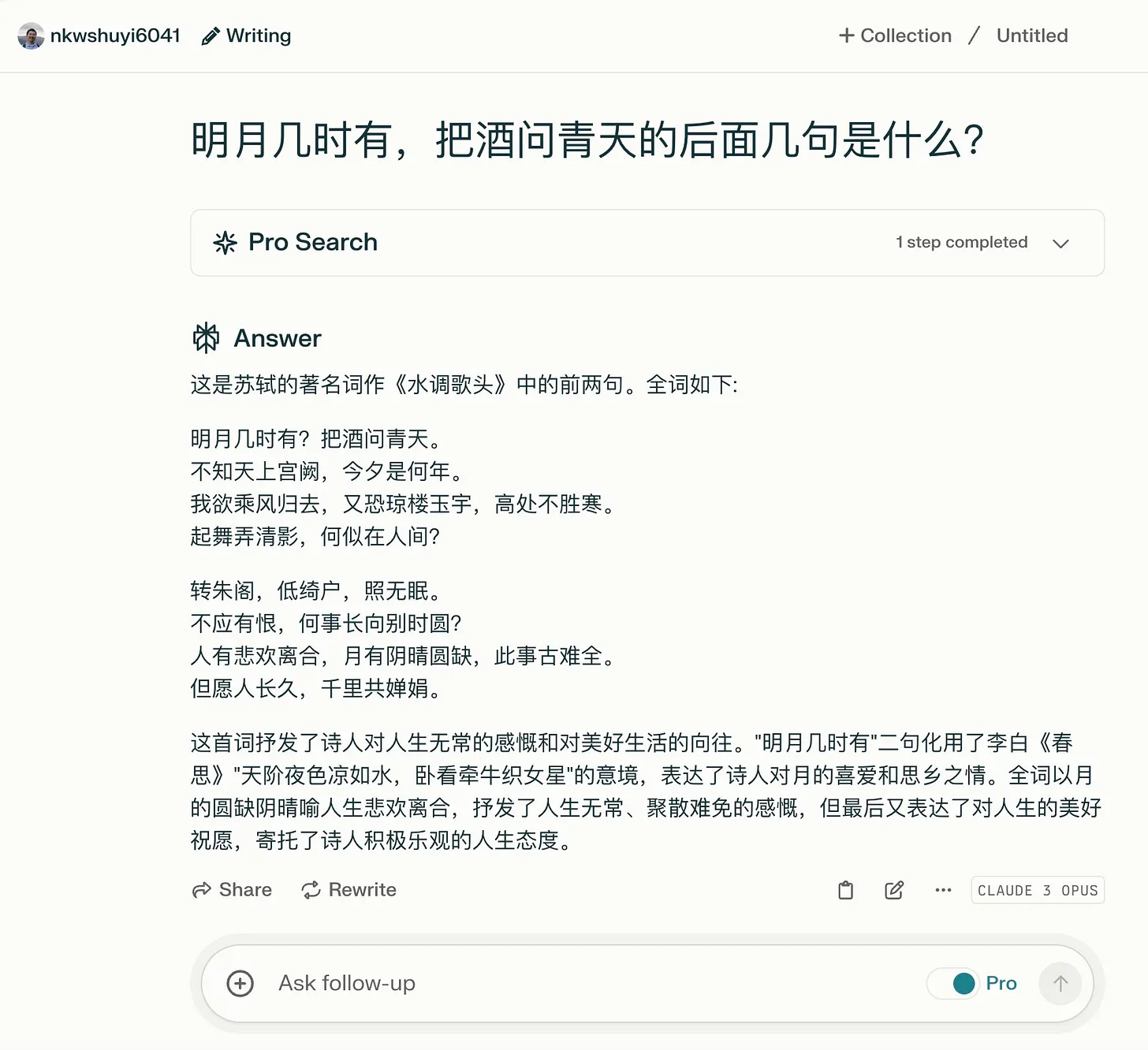如果你只需要与 Claude 3 Opus 进行对话,可以尝试我之前推荐的 Perplexity。选择 Writing 模式后,你每天可以与 Claude 3 Opus 对话 600 次,额度用完后第二天会恢复,性价比远高于 Poe。