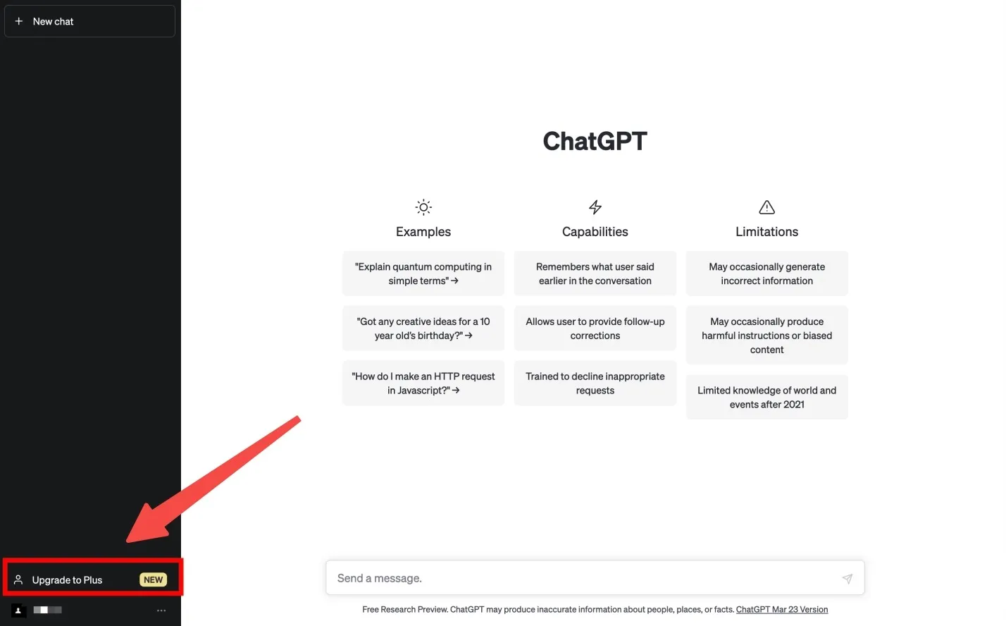 在浏览器地址栏输入 OpenAI 官网 访问,登录您的 OpenAI 账户后,点击左下角的 “Upgrade to Plus”,在弹窗中选择 “Upgrade plan”。