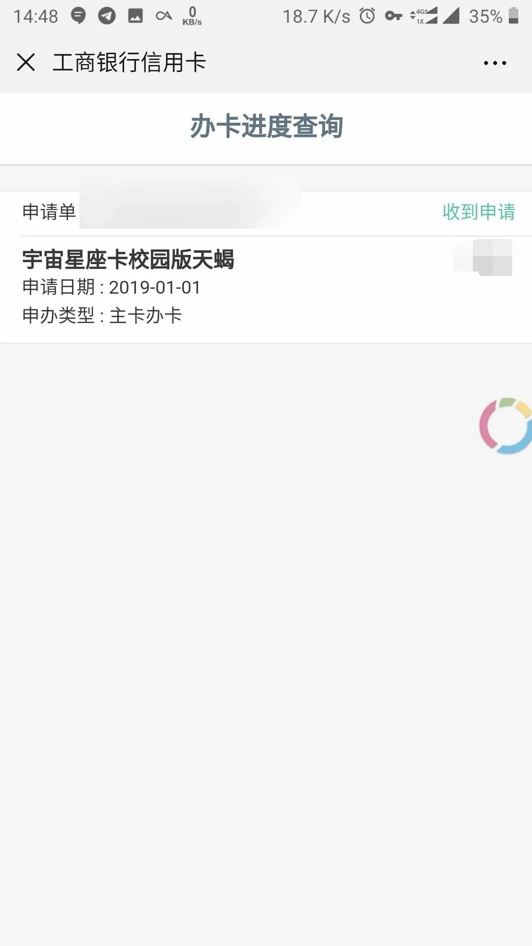 可以通过工行的「工银 e 生活」或微信查询申请进度。微信可以关注「中国工商银行客户服务」,点击菜单中的「智金融」→「信用卡」,再点页面上的「查询进度」来查询。