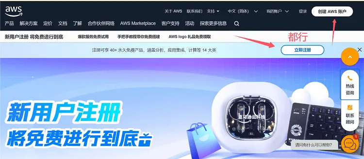 打开 亚马逊云免费试用官网,点击“立即注册”或“创建AWS账户”。