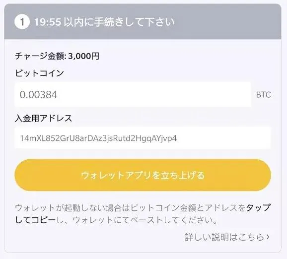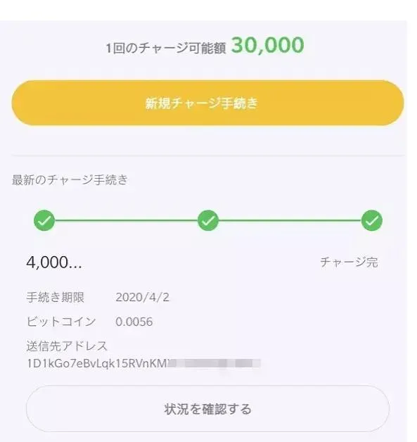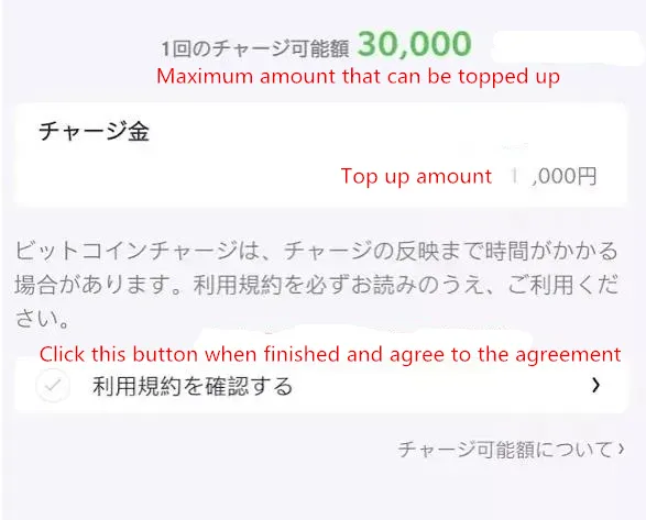 单击“チャー”按钮,找到比特币徽标,输入充值金额(必须是1000的整数倍)。