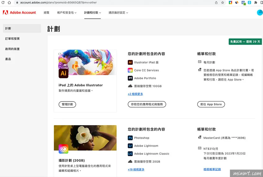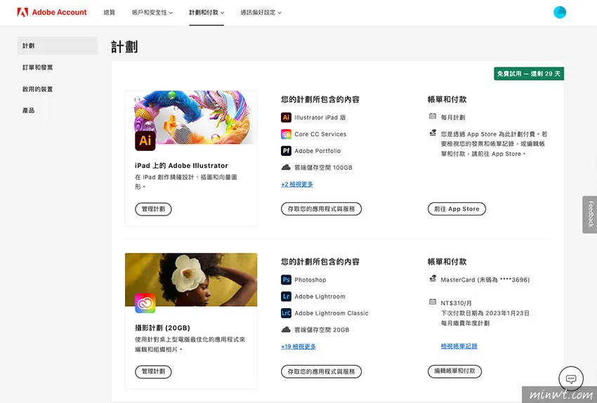 首先,登录您的 Adobe ID,您将看到当前已订阅的软件列表,包括 iPad 的订阅计划。但请注意,该页面只能取消电脑版的订阅,平板的订阅需通过 Apple Store 进行取消。