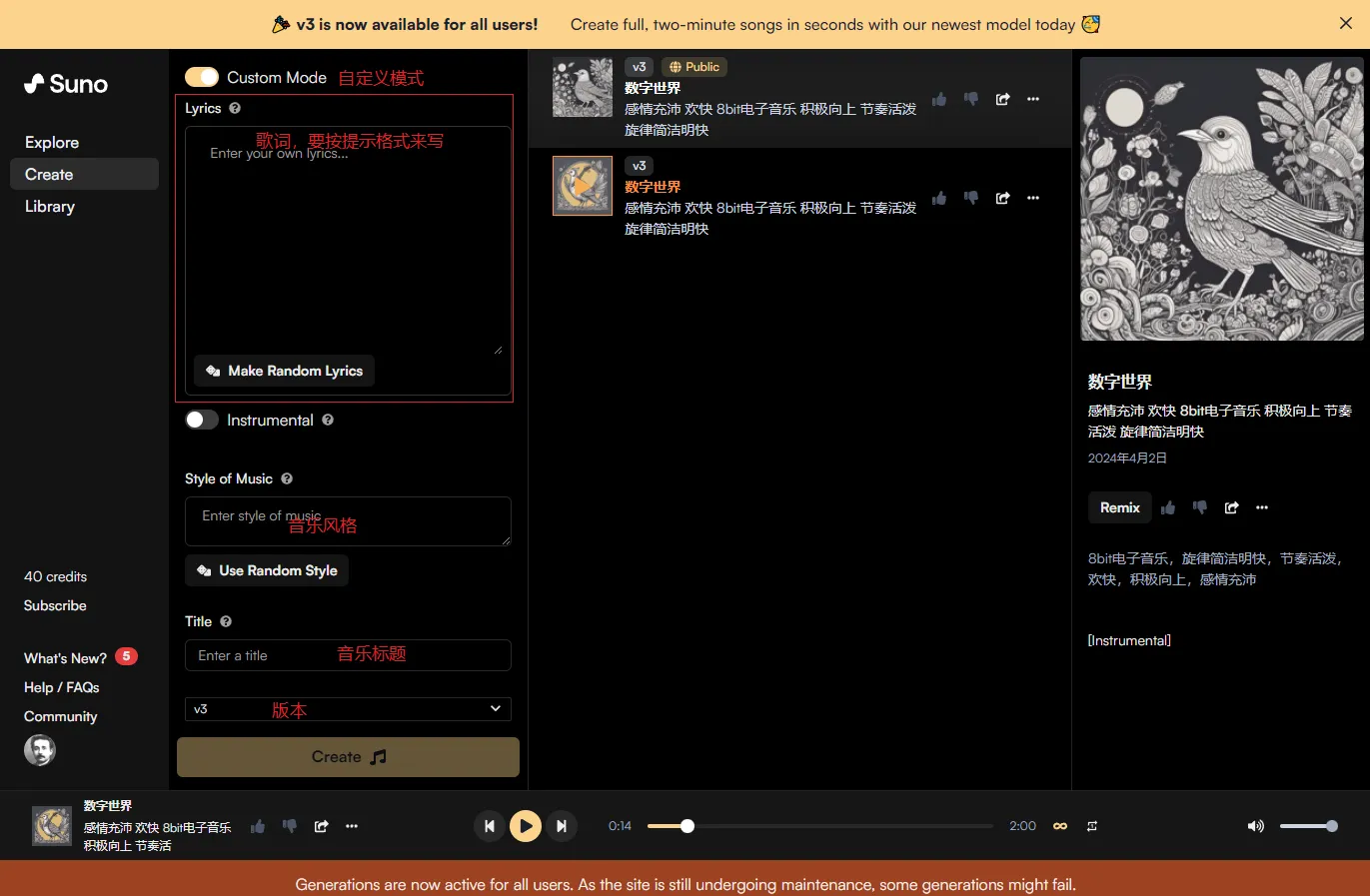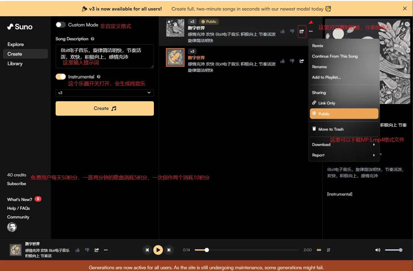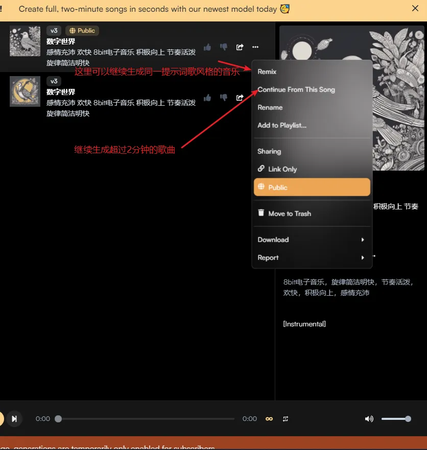 需要注意的是,每次生成的曲子时长限制为2分钟。如果想要生成超过2分钟的曲子,需要继续让Suno接着创作,完成后可以选择下载整首曲子。