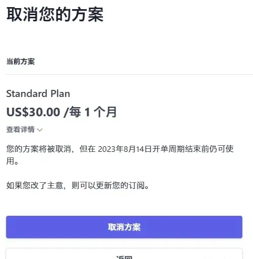 - 在弹出的菜单中,选择“Cancel at end of subscription period”,然后确认取消。