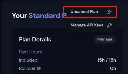 依次点击:Manage Sub → Manage → Uncancel Plan,即可重新开启订阅。