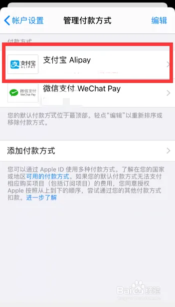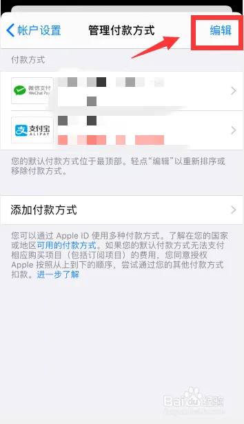 - 管理付款方式,点击“编辑”,选择要解除绑定的支付方式。