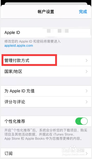 - 在Apple ID页面,找到并点击“管理付款方式”。