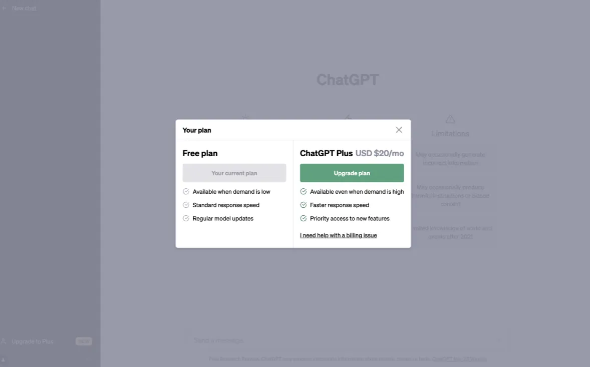 - 在浏览器地址栏输入 chat.openai.com 访问OpenAI,登录您的账户后,点击左下角的“Upgrade to Plus”,在弹窗中选择“Upgrade plan”。