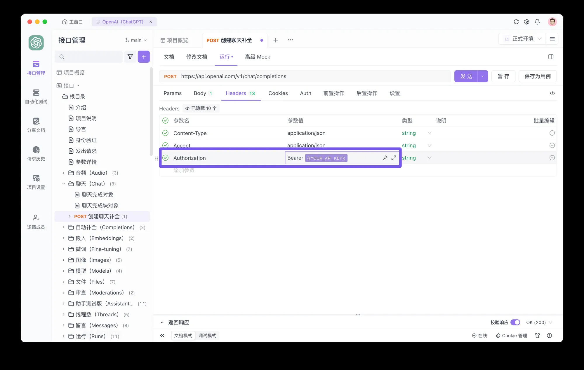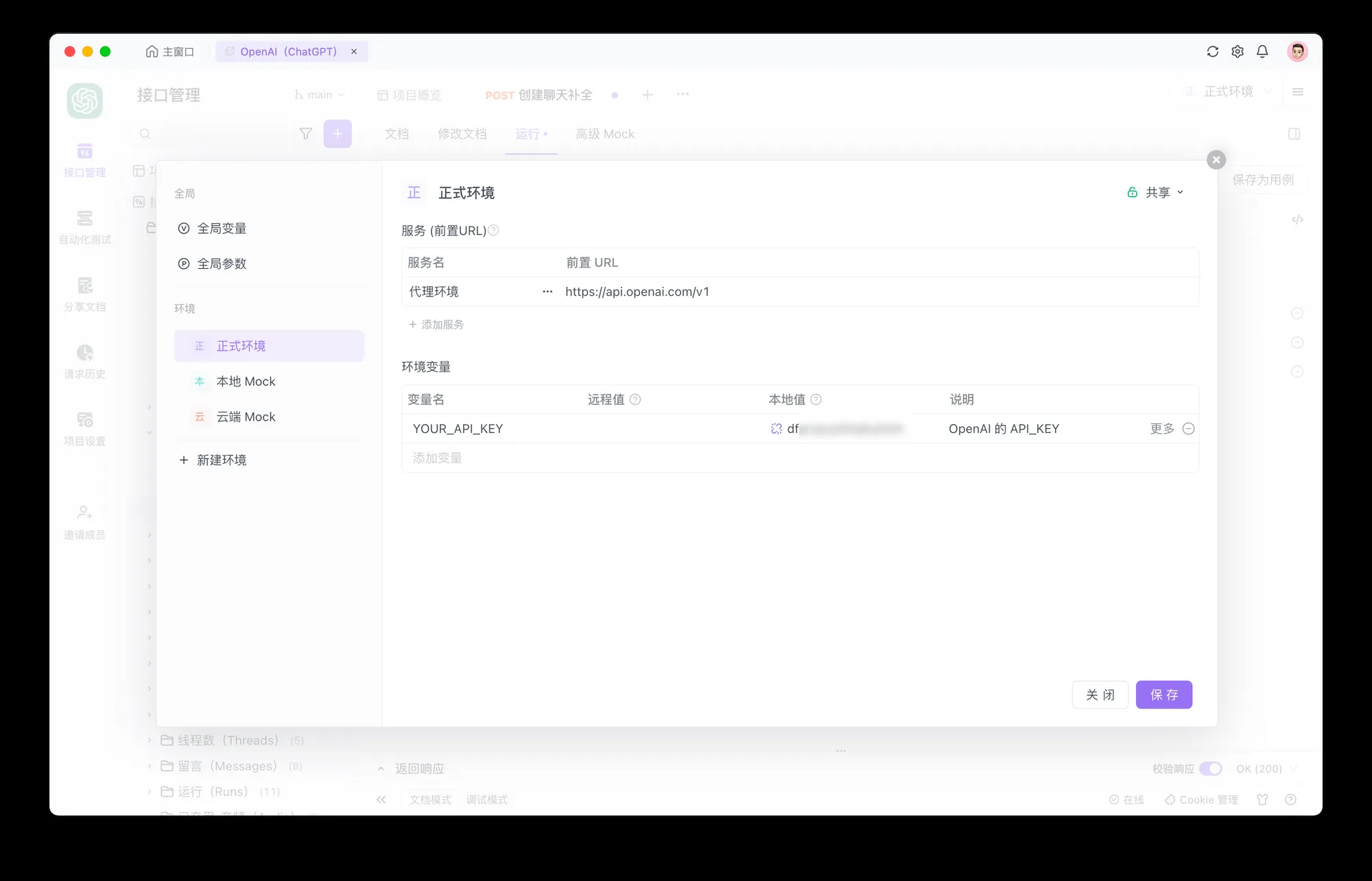 在 Apifox 中,你可以将 OpenAI API 密钥存储为环境变量,以后可以直接引用,避免重复输入。