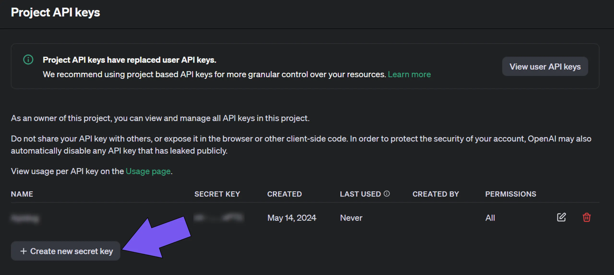 创建账户后,访问 OpenAI 的 API 密钥页面并登录,点击“Create new secret key”生成新的 API 密钥。