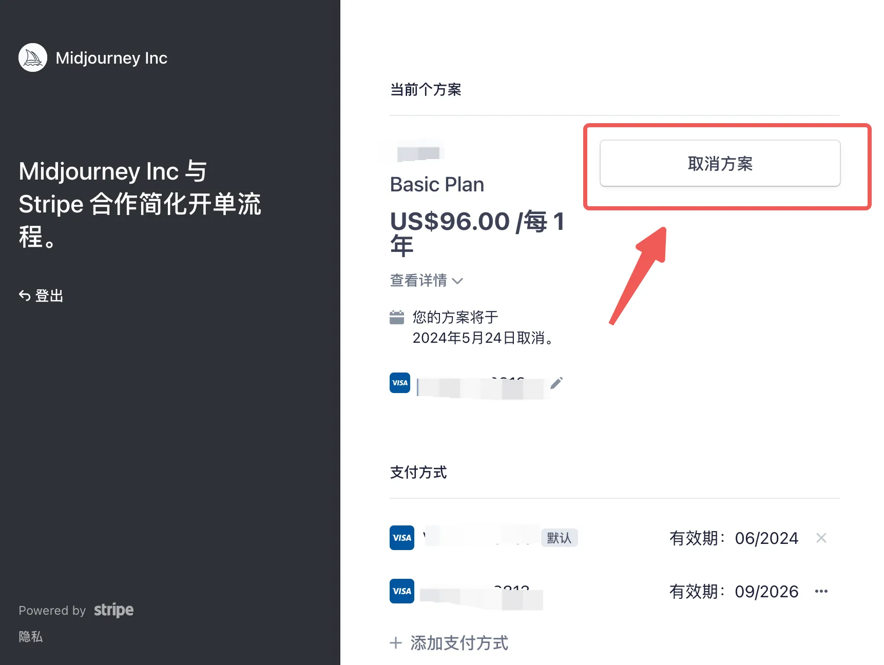 进入 MidJourney 的 Stripe 页面后,点击「取消方案」可以取消订阅。