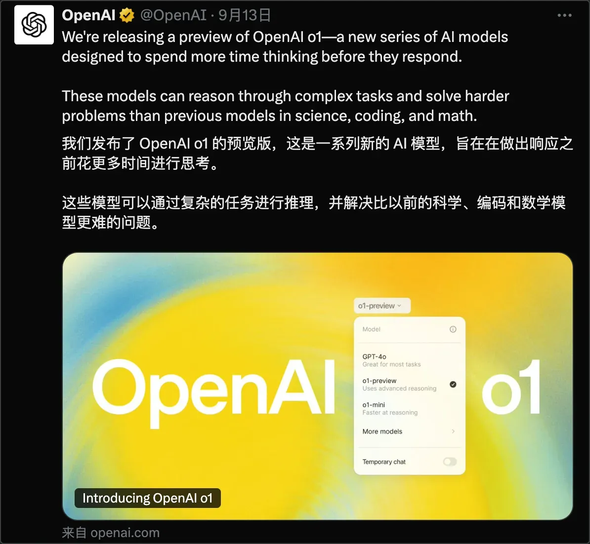 OpenAI 于 9 月 13 日发布了 o1 的预览版。
