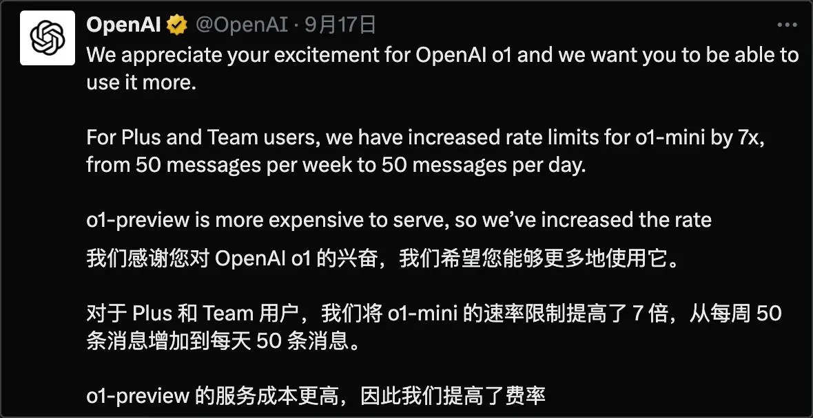 9 月 17 日,OpenAI 宣布放宽了使用限额,o1-preview 现在为每周 50 次查询,o1-mini 改为每天 50 次查询。