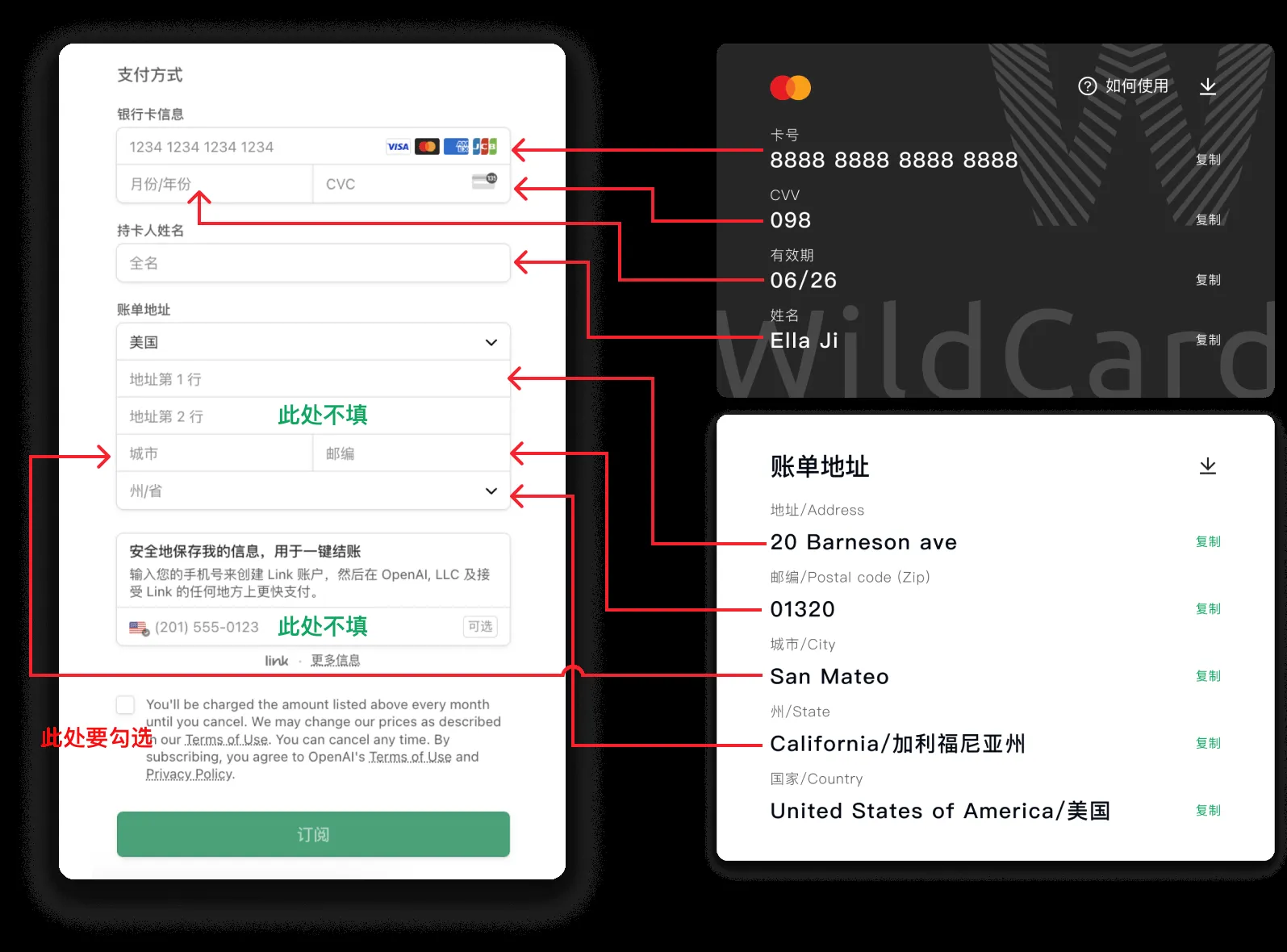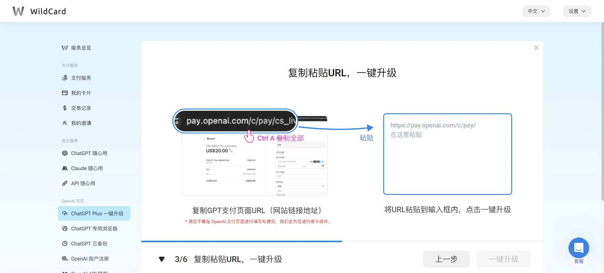 此外,您也可以使用 野卡 提供的一键升级 ChatGPT Plus 的功能,只需将付款链接填入即可实现,非常方便。