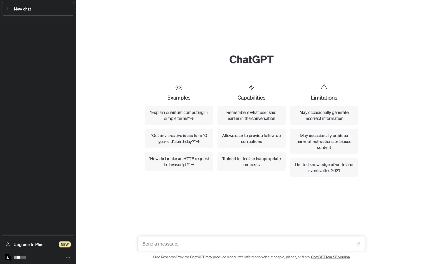 进入 ChatGPT 点击左下角的「Upgrade to Plus」按钮: