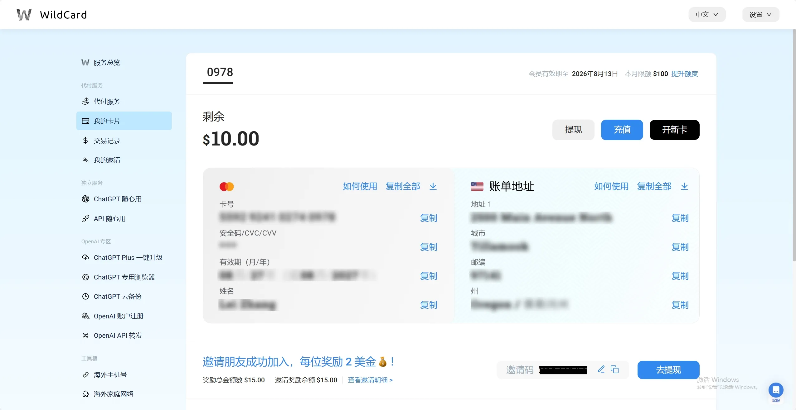 注册成功后,首次开卡费用为 $11.99,使用邀请码注册可享受 $1.00 的优惠,开卡费用为 $10.99,后续开卡费用降至 $9.99。
