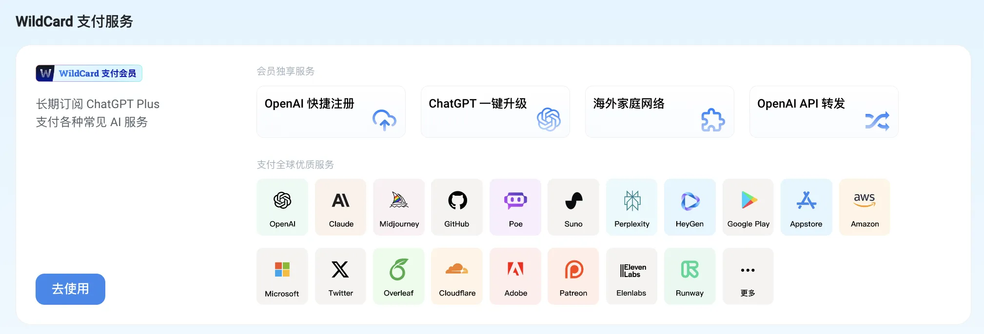 野卡 提供一站式海外支付服务,让您几乎“零门槛”轻松订阅各种海外软件服务。此外,为了满足不同用户的需求,野卡 提供了会员专享支付服务和即买即用的 GPT4+Claude 随心用两大服务方式。