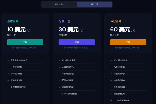 Midjourney 提供多种订阅选项,包括 10 美元/月、30 美元/月 和 60 美元/月。按年付费会稍微便宜些。
