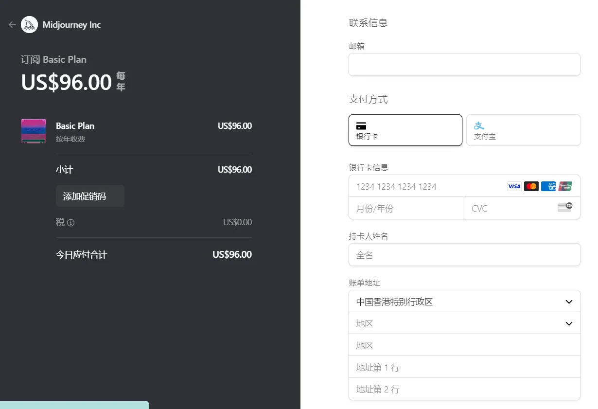 将您在 野卡 的虚拟信用卡信息填写到 Midjourney 绑卡界面中对应位置