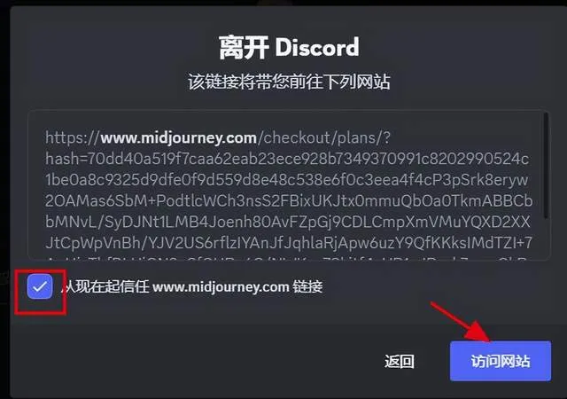 勾选并点击 访问网站,接下来将进入 Midjourney 的订阅页面。