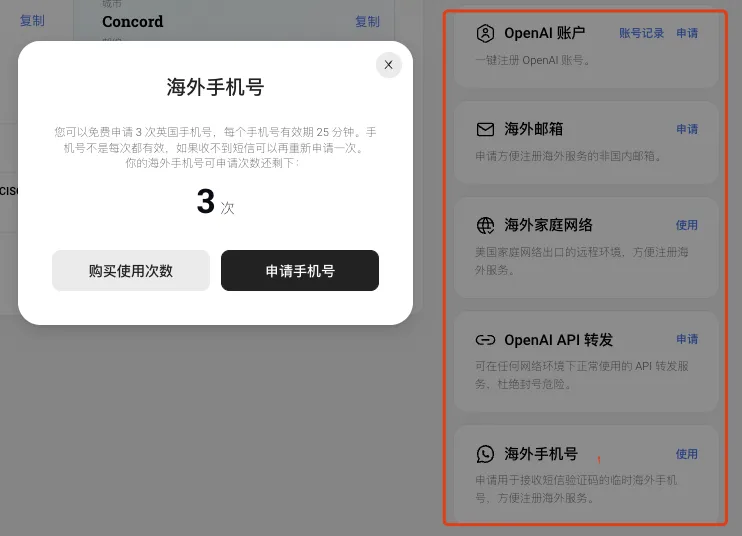 此外,野卡 还提供 海外邮箱、海外家庭网络、海外手机号短信验证等服务,但使用次数有限,超出后需付费购买。