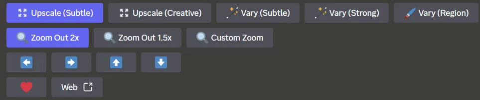 选择需要的子图后,可以继续点击下方按钮对图片进行修改,主要包括 Upscale(提高分辨率)、Zoom out(向外扩展图)、Vary(更新图像)和平移。