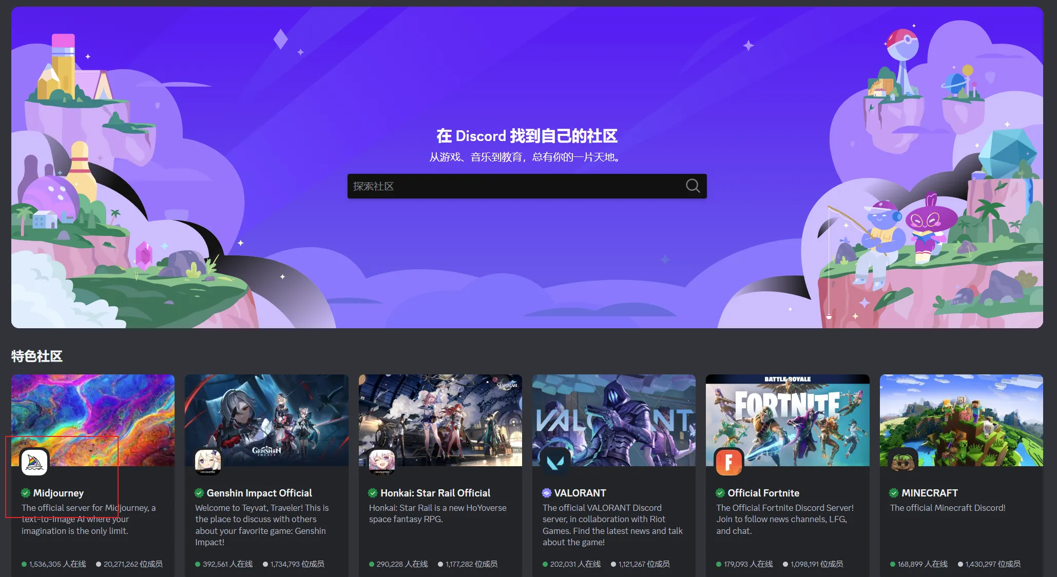 探索可发现的服务器按钮,打开服务器界面,找到下方的Midjourney群组并点击。如果没有找到,可以在搜索框中搜索。