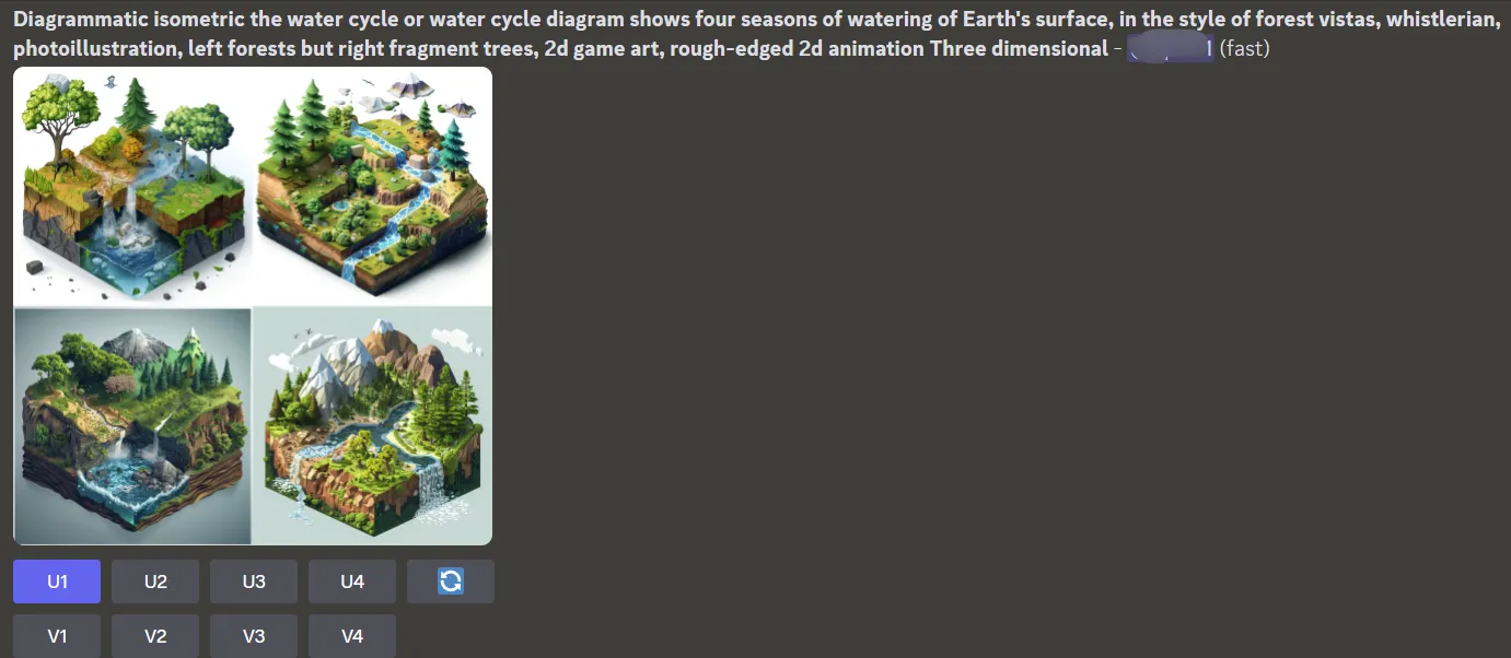 - V1~V4 (Vary):对所选图像进行进一步变化,生成的图风格和构图与所选图像相似。