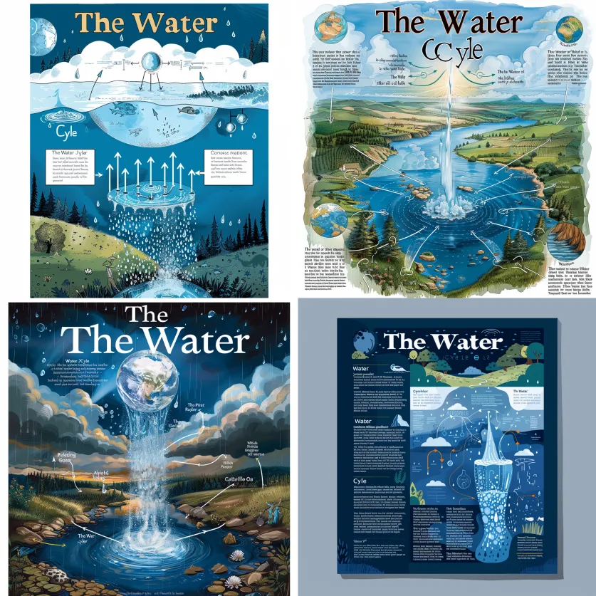 /imagine An educational poster titled “The Water Cycle” that depicts the water cycle from its source to oceans, highlighting key elements such as clouds and raindrops in blue color on one side of the page. The other half shows an illustration showing vegetation, rivers, lakes, etc., with arrows connecting them all around. There is also text detailing each step in the process, along with notes about soil, air, atmosphere, and Earth’s surface waters.