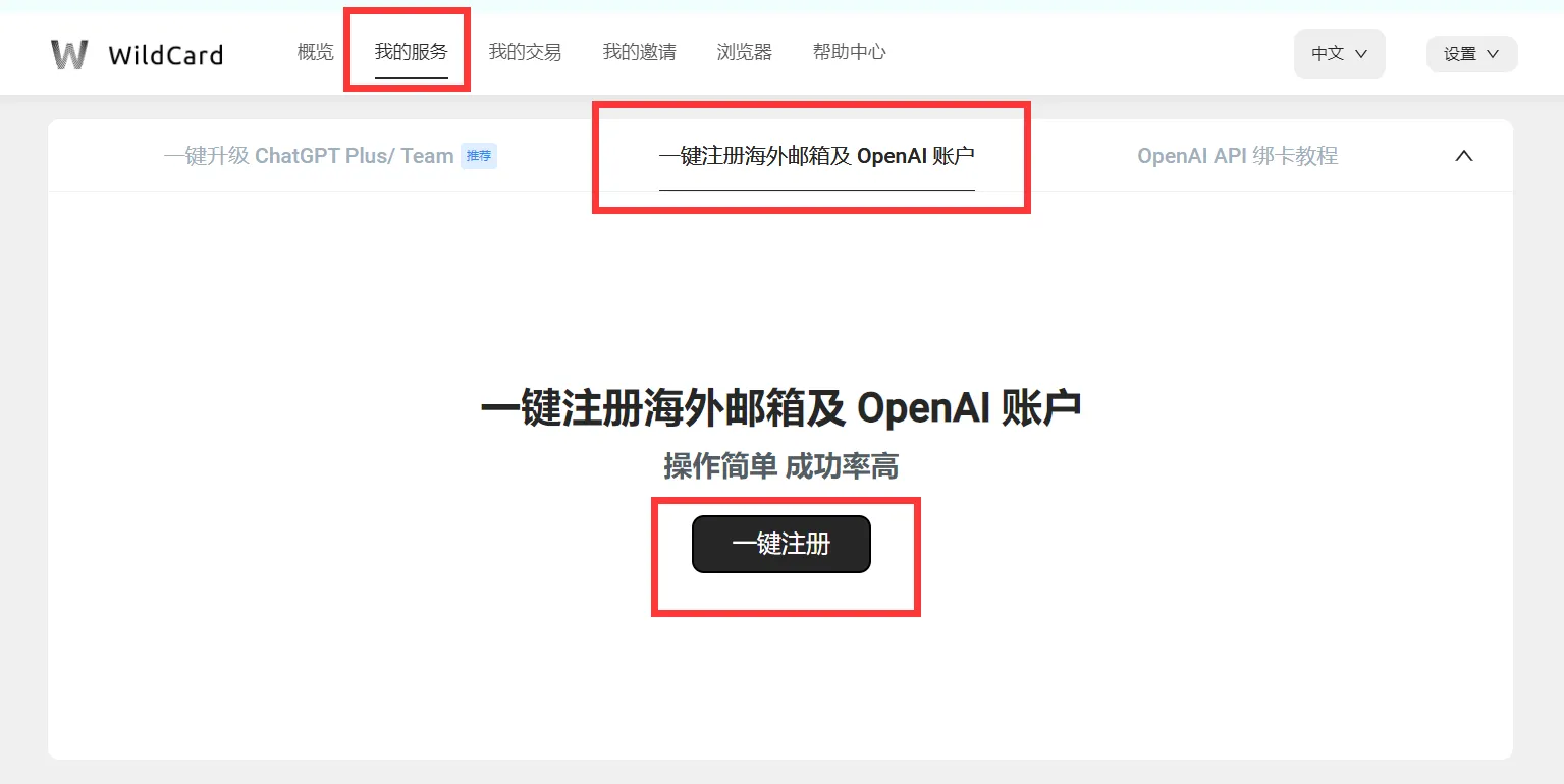 首先,访问 野卡 官网,点击“我的服务”,找到“一键注册 OpenAI 账户”,然后点击“一键注册”。
