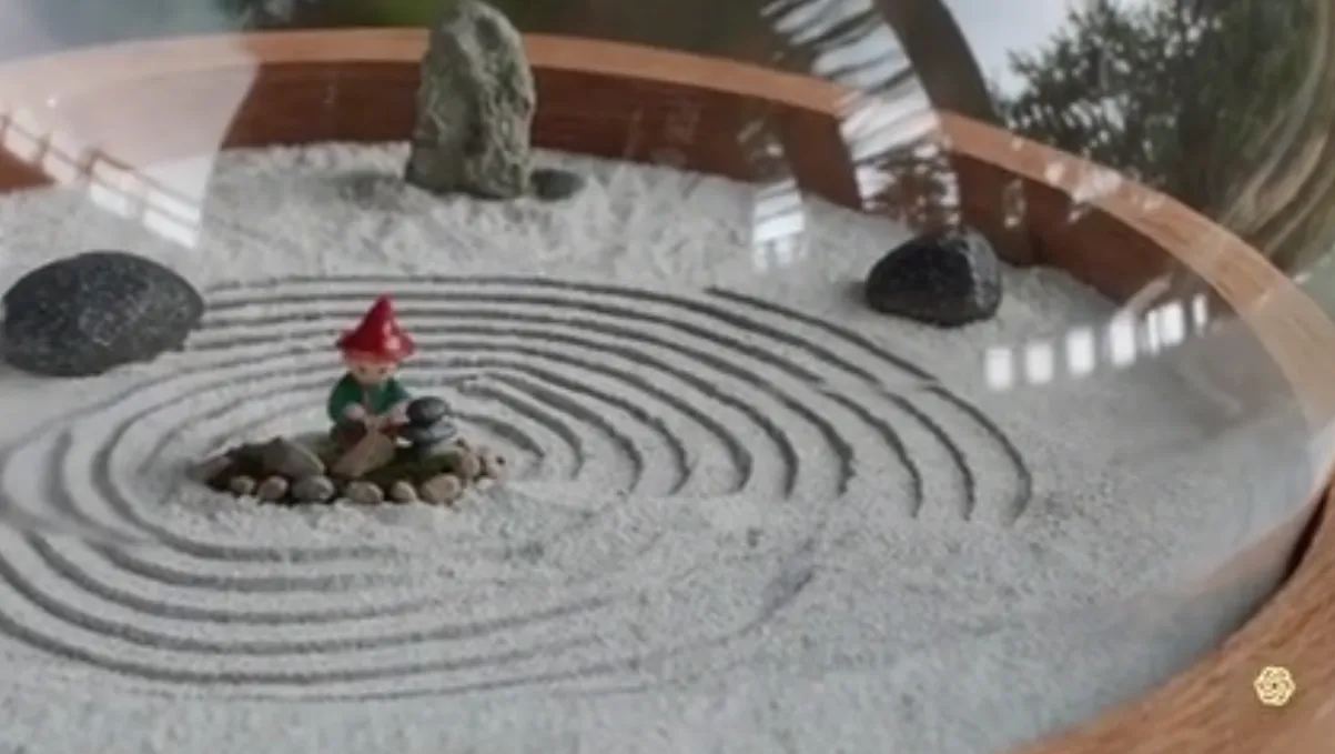 示例3: 放大观看一个玻璃球,里面有一个禅宗花园。球内有一个小矮人,他正在用耙子整理禅宗花园,并在沙地上创造出图案。
