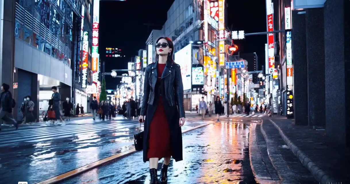 示例1: 一位时尚的女性走在东京街头,周围是温暖闪亮的霓虹灯和活力四射的城市标识。她穿着一件黑色皮夹克,一条长长的红色连衣裙,搭配黑色靴子,并背着一个黑色手提包。她戴着墨镜,涂着红色口红。她步履自信,悠然自得地走着。街道潮湿而反光,呈现出丰富多彩的灯光的镜面效果。